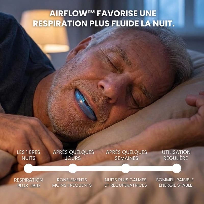 Combattez la cause profonde du ronflement et offrez-vous, ainsi qu'à vos proches, une bonne nuit de sommeil ! Si vos tentatives précédentes pour arrêter de ronfler ont été décevantes, ne vous en faites pas . Les autres solutions ne s'attaquent pas à la cause première : l'affaissement des tissus mous dans votre gorge. Avec AirFlow™, vous profiterez d'un meilleur sommeil, d'une productivité accrue, d'un système immunitaire renforcé et de relations plus harmonieuses. De plus, il réduit les risques de maladies cardiaques et d'AVC ! En quelques nuits seulement !